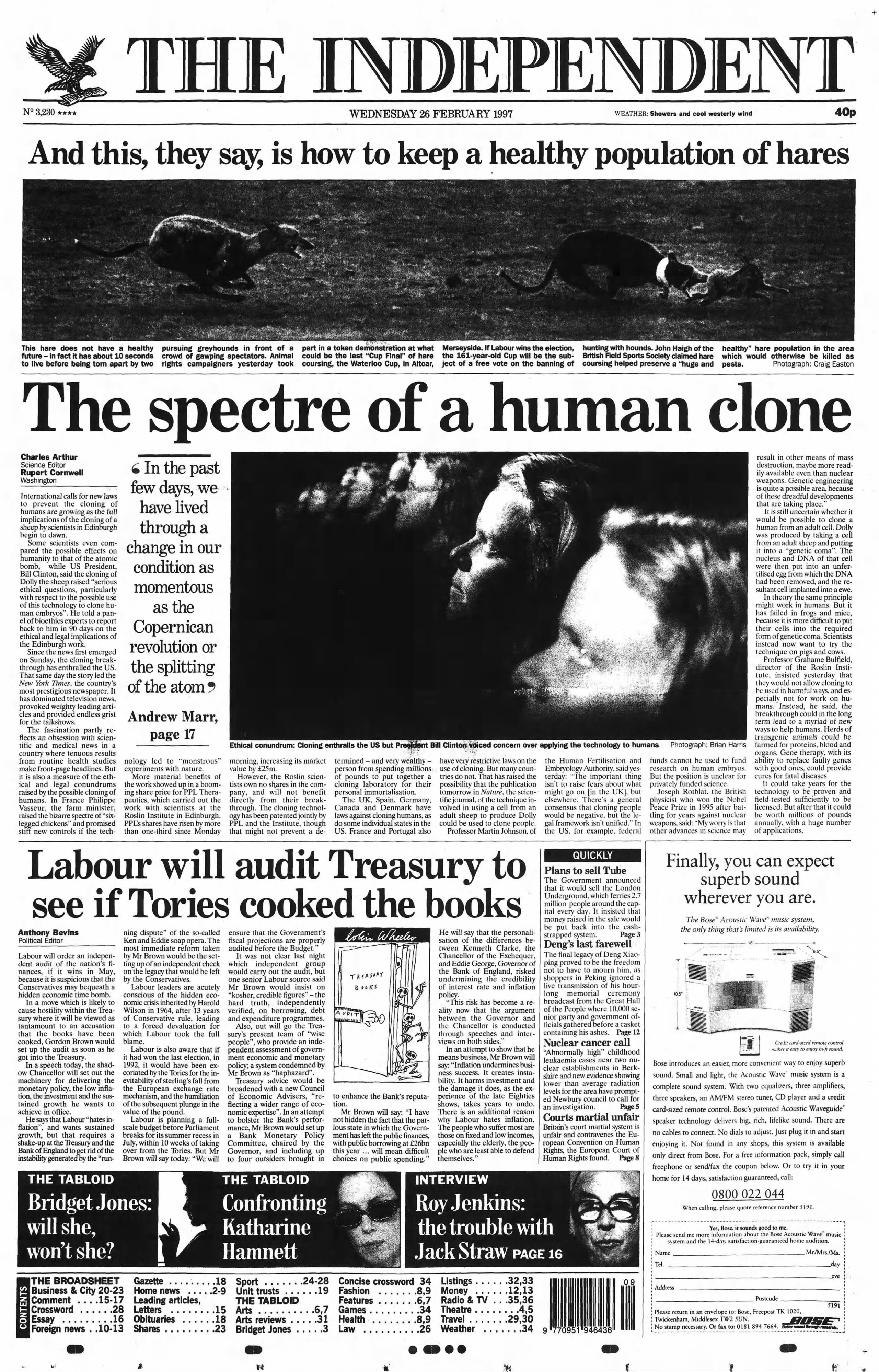 The cloning of Dolly the sheep by scientists in Edinburgh triggers urgent international debate over the prospect of human cloning. Political leaders and bioethicists call for new laws, with US president Bill Clinton warning of “serious ethical questions” and commissioning a rapid review of the implications. The Independent’s Andrew Marr writes: “In the past few days, we have lived through a change in our condition as momentous as the Copernican revolution or splitting the atom.” Indeed, the breakthrough goes on to fuel years of global debate over genetic ethics and fears of so-called “designer” babies.
