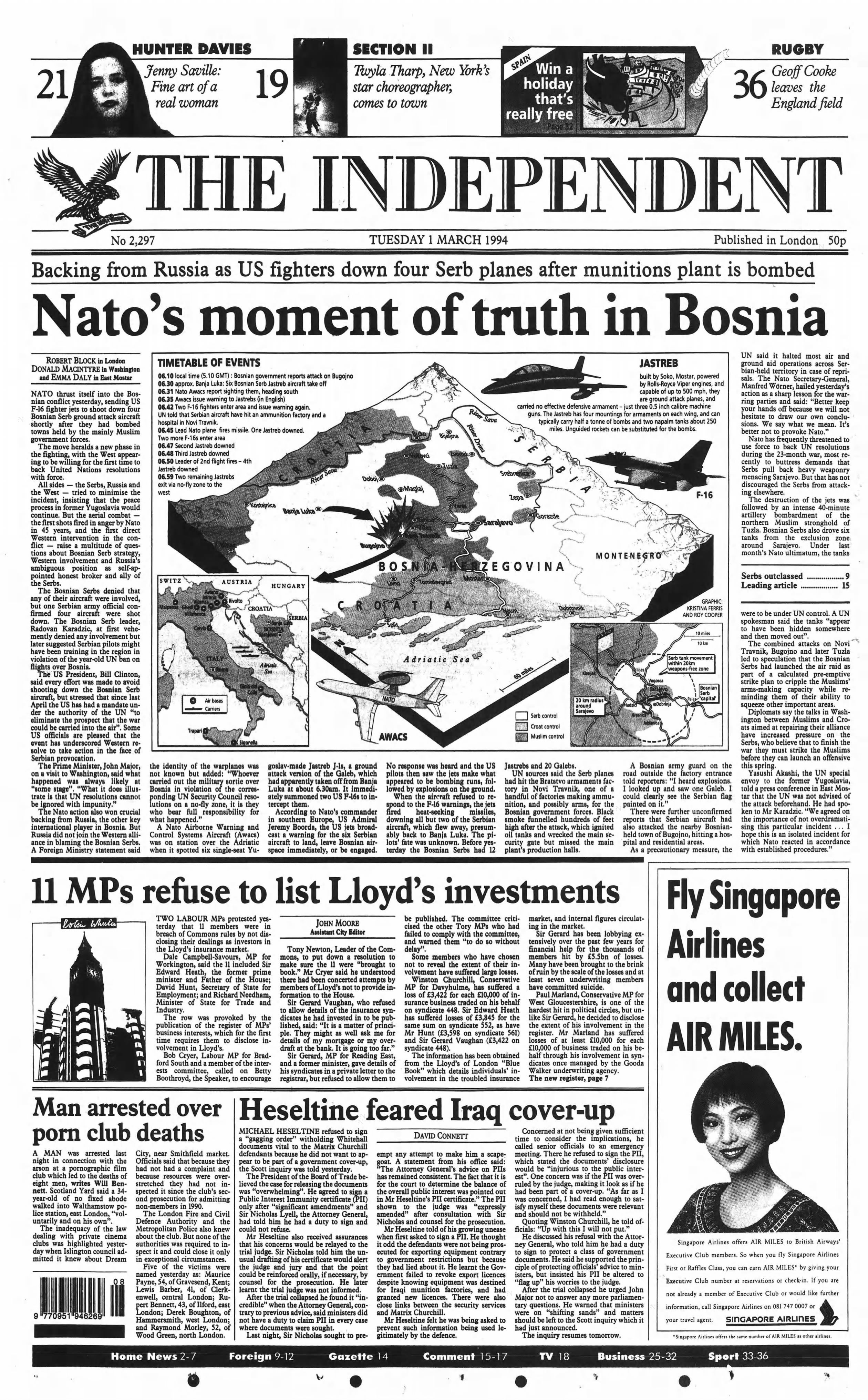 US F-16 fighter jets shoot down four Serb aircraft after they bomb towns held by Bosniak government forces, marking the first time in its 45-year history that Nato fires shots in anger. The action signals a decisive shift, as Western powers prepare to enforce UN resolutions with military force in the Bosnian conflict. Although Russia and other parties move to play down the incident to protect fragile peace efforts, the intervention opens a new and more assertive phase of international involvement in the war.